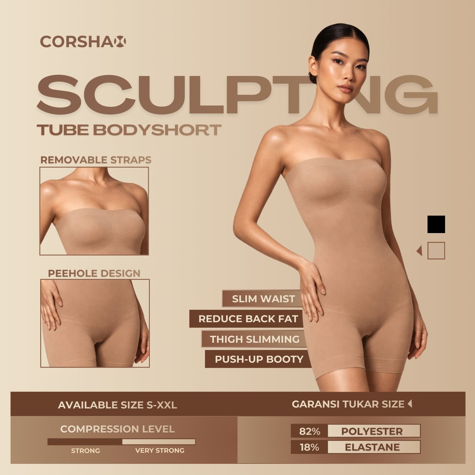 Tube bodyshort designed to smooths your waist, slims your thighs, and supports your shape. Designed with a peehole and removable straps for versatility and comfort.